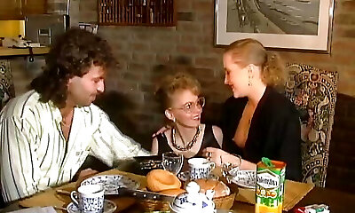 2 marvelous German chicks sharing a loaded cock on the kitchen table